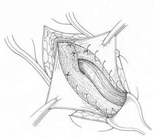 При паховой герниопластике по Лихтенштейну медиальный край сетки преперитонеально подшивают к поперечной фасции, латеральный – к пупартовой связке, и к лонному бугорку. В другой модификации сетку подшивают к передней поверхности поперечной фасции. В обоих случаях операция обеспечивает основной принцип грыжесечения – выполнение пластики без натяжения тканей. Для подшивания сетки необходимо использовать качественный шовный материал. Скопление крови или серозной жидкости в области эндопротеза крайне нежелательно, так как предрасполагает к инфицированию. Поэтому некоторые хирурги рекомендуют на сутки оставлять в ране дренаж небольшого диаметра. |